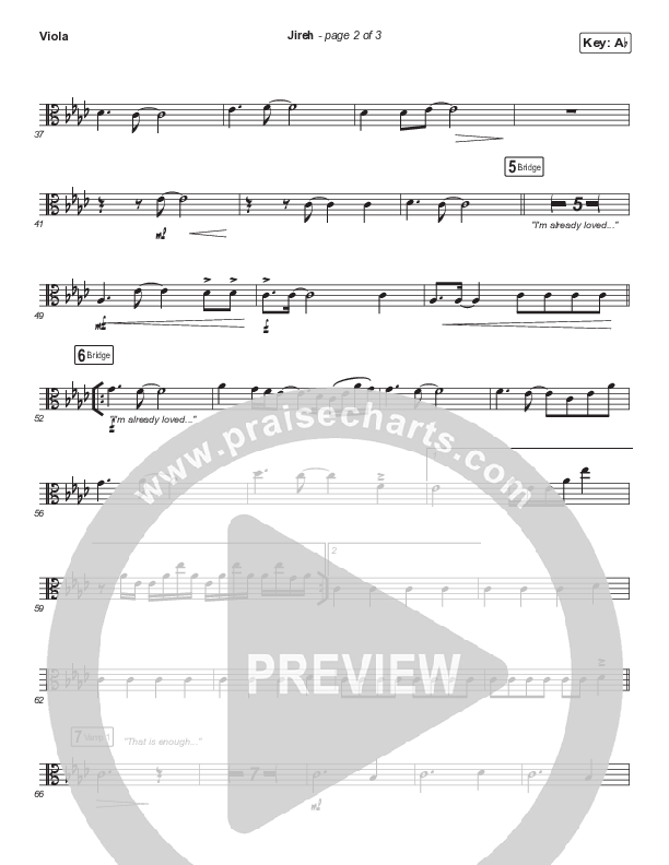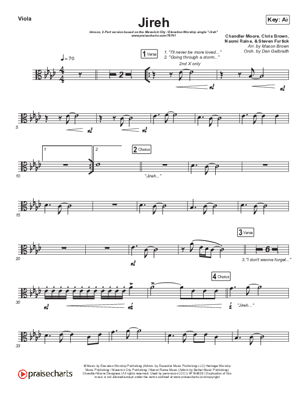 Download the Viola sheet music for Jireh (Unison/2-Part Choir) by Maverick City Music / Elevation Worship / Arr. Mason Brown, from the album Old Church Basement. This song was arranged by Mason Brown / Luke Gambill / Daniel Galbraith in the key of Ab.