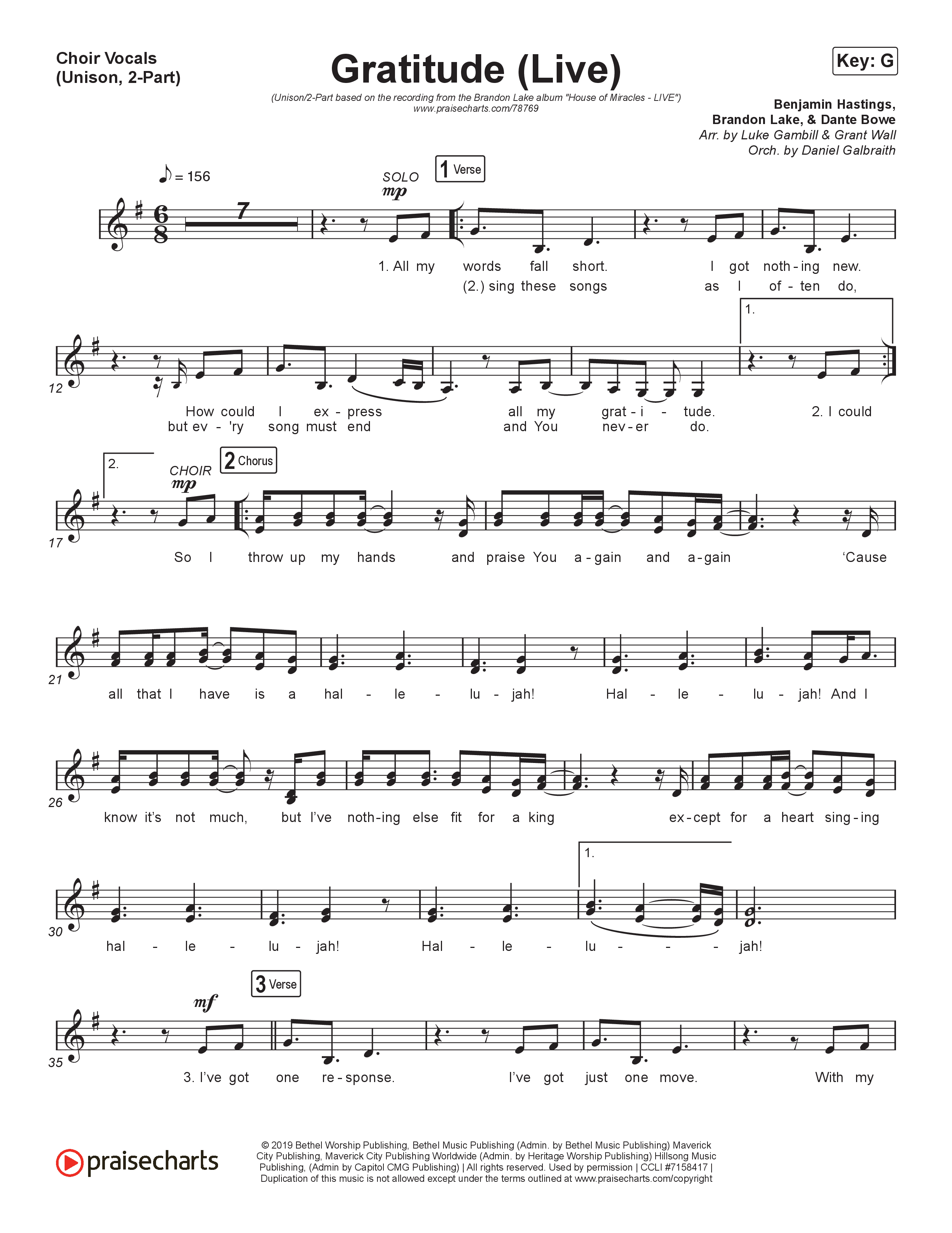Download the PDF sheet music for Gratitude (Live) (Unison/2-Part Choir) by Brandon Lake / Arr. Luke Gambill, from the album House Of Miracles. This song was arranged by Luke Gambill / Daniel Galbraith / Grant Wall in the key of G.