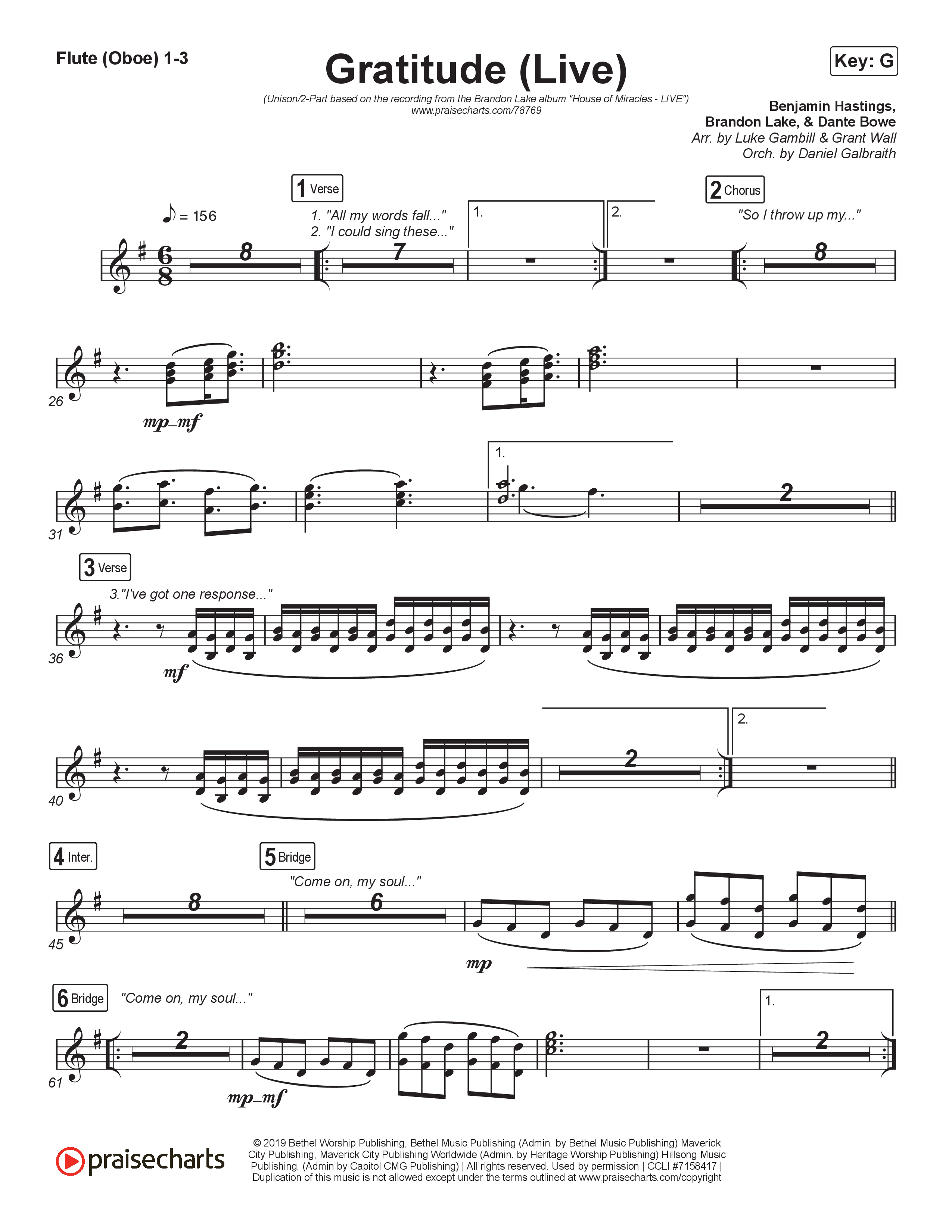 Download the Orchestration wind parts for Gratitude (Live) (Unison/2-Part Choir) by Brandon Lake / Arr. Luke Gambill, from the album House Of Miracles. This song was arranged by Luke Gambill / Daniel Galbraith / Grant Wall in the key of G.