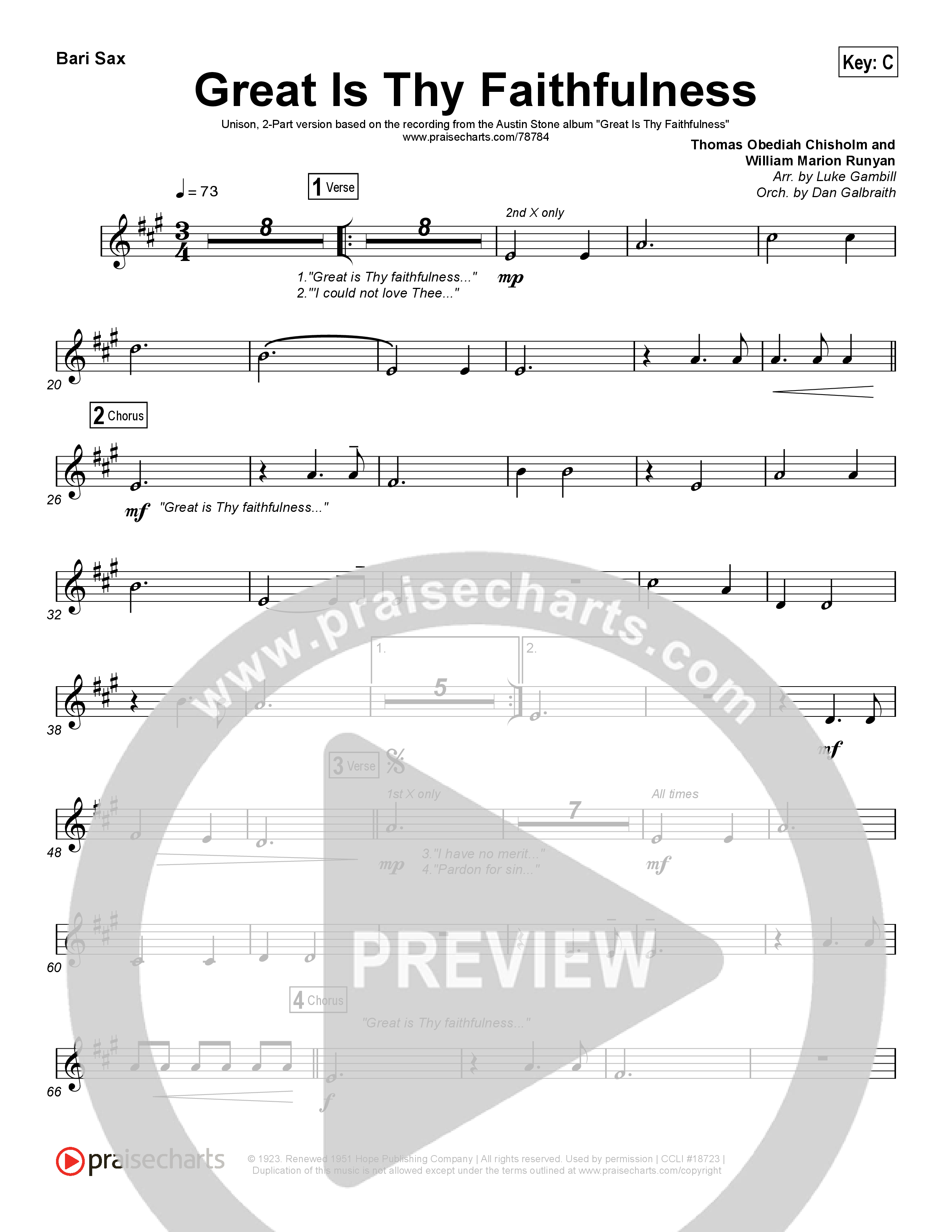 Download the Bari Sax sheet music for Great Is Thy Faithfulness (Unison/2-Part Choir) by Austin Stone Worship / Arr. Luke Gambill, from the album Great Is Thy Faithfulness. This song was arranged by Luke Gambill / Daniel Galbraith in the key of C.