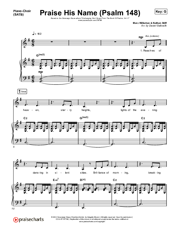 Download the PDF sheet music for Praise His Name (Psalm 148) by Sovereign Grace, from the album Unchanging God: Songs From The Book Of Psalms Vol 2. This song was arranged by Daniel Galbraith in the key of A, G.