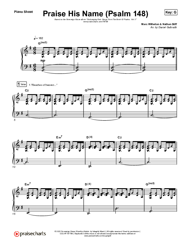 Download the piano sheet for Praise His Name (Psalm 148) by Sovereign Grace, from the album Unchanging God: Songs From The Book Of Psalms Vol 2. This song was arranged by Daniel Galbraith in the key of A, G.