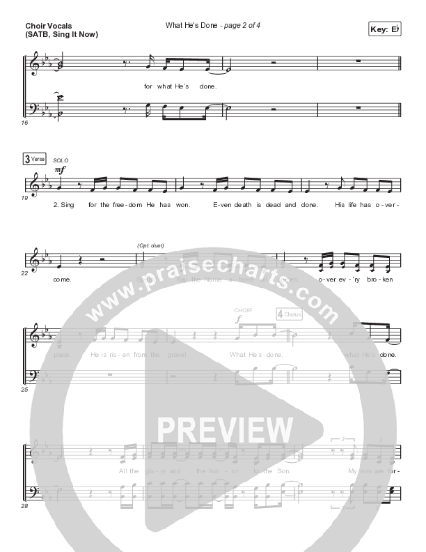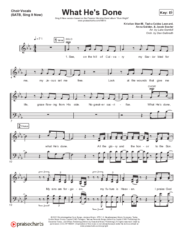 Download the PDF sheet music for What He's Done (Sing It Now SATB) by Passion / Kristian Stanfill / Tasha Cobbs Leonard / Anna Golden / Arr. Luke Gambill, from the album Burn Bright (Studio EP). This song was arranged by Luke Gambill in the key of Eb.