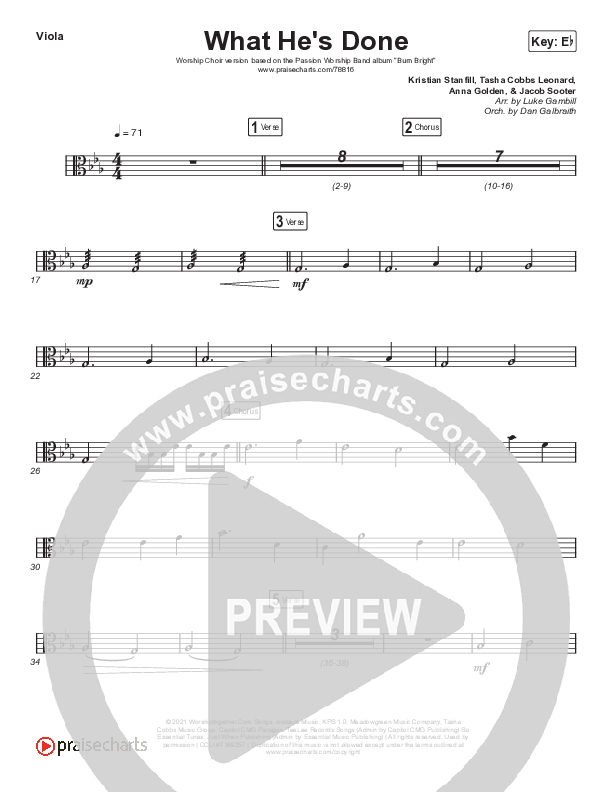 Download the Orchestration string parts for What He's Done (Worship Choir SAB) by Passion / Kristian Stanfill / Tasha Cobbs Leonard / Anna Golden / Arr. Luke Gambill, from the album Burn Bright (Studio EP). This song was arranged by Luke Gambill in the key of Eb.