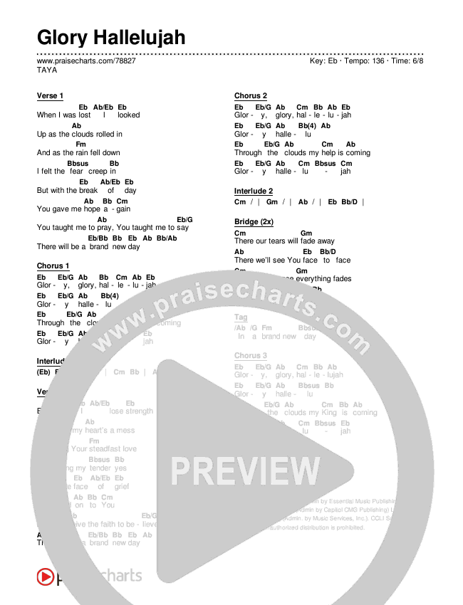 Download the PDF Chord Charts for Glory Hallelujah by TAYA, from the album TAYA.