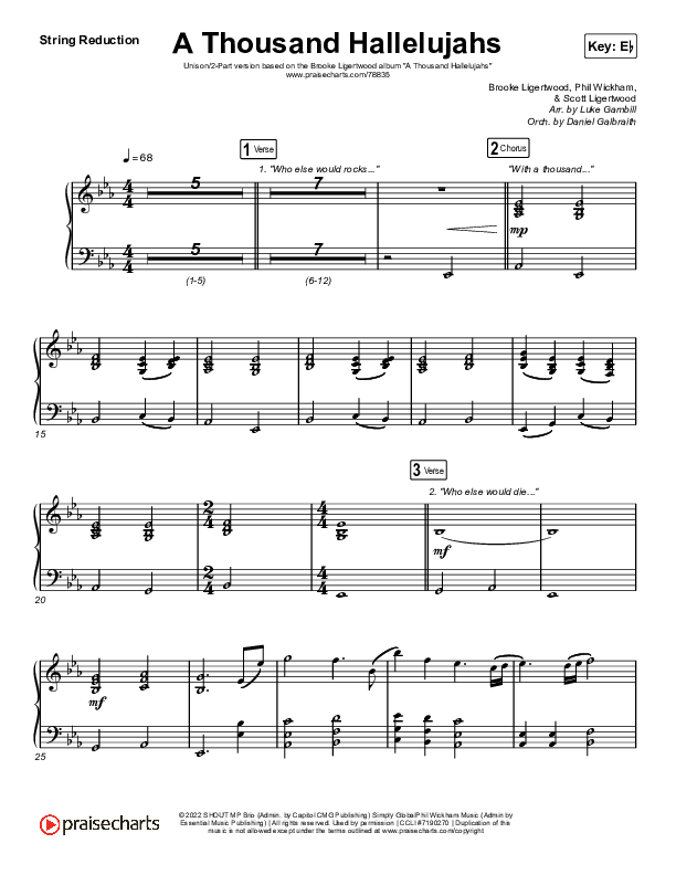 Download the String Reduction sheet music for A Thousand Hallelujahs (Unison/2-Part Choir) by Brooke Ligertwood / Arr. Luke Gambill, from the album A Thousand Hallelujahs. This song was arranged by Luke Gambill / Daniel Galbraith / Grant Wall in the key of Eb.
