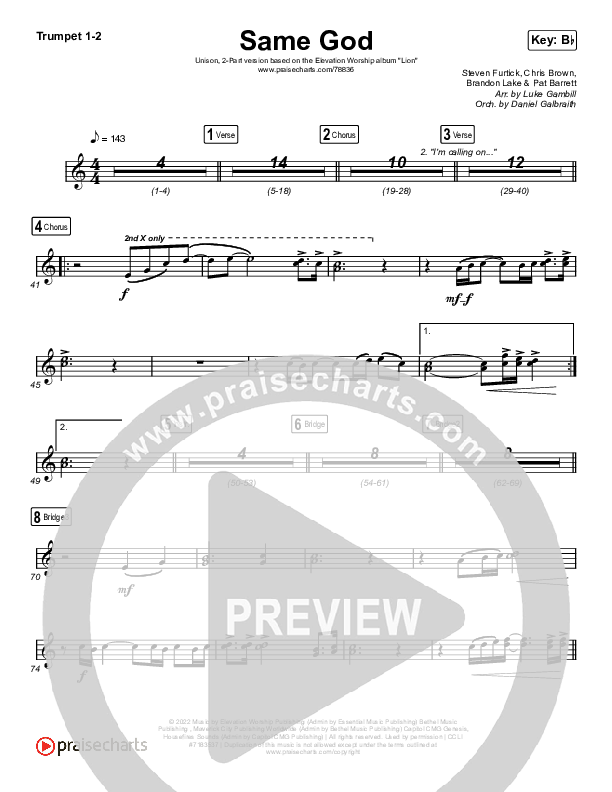 Download the trumpet sheet music for Same God (Unison/2-Part Choir) by Elevation Worship / Jonsal Barrientes / Arr. Luke Gambill, from the album LION. This song was arranged by Luke Gambill / Daniel Galbraith / Grant Wall in the key of Bb.