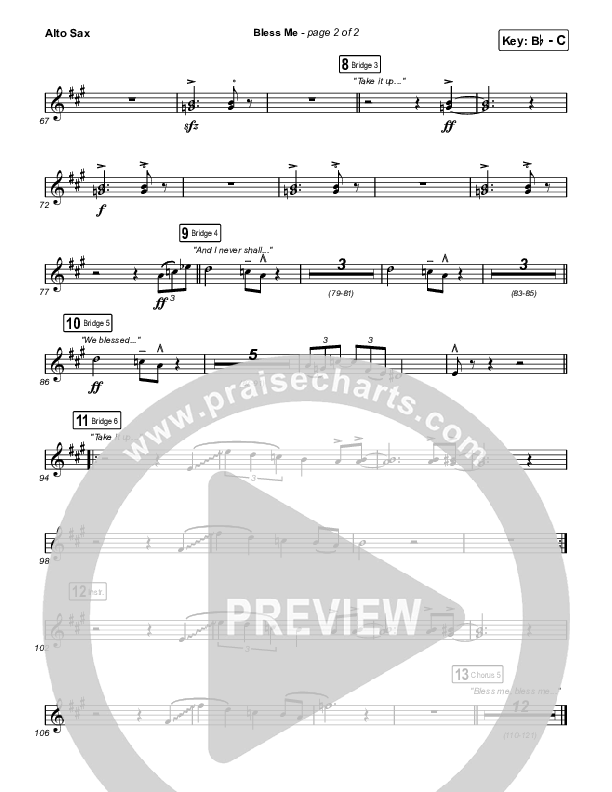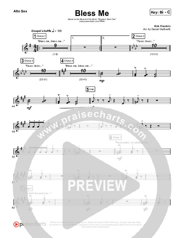 Download the Saxaphone instruments PDF sheet music for Bless Me by Kirk Franklin / Maverick City Music, from the album Kingdom: Book One. This song was arranged by Daniel Galbraith in the key of Bb, C.