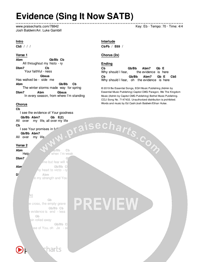 Download the PDF Chord Charts for Evidence (Sing It Now SATB) by Josh Baldwin / Arr. Luke Gambill, from the album Evidence. This song was arranged by Luke Gambill / Daniel Galbraith / Grant Wall in the key of Eb.