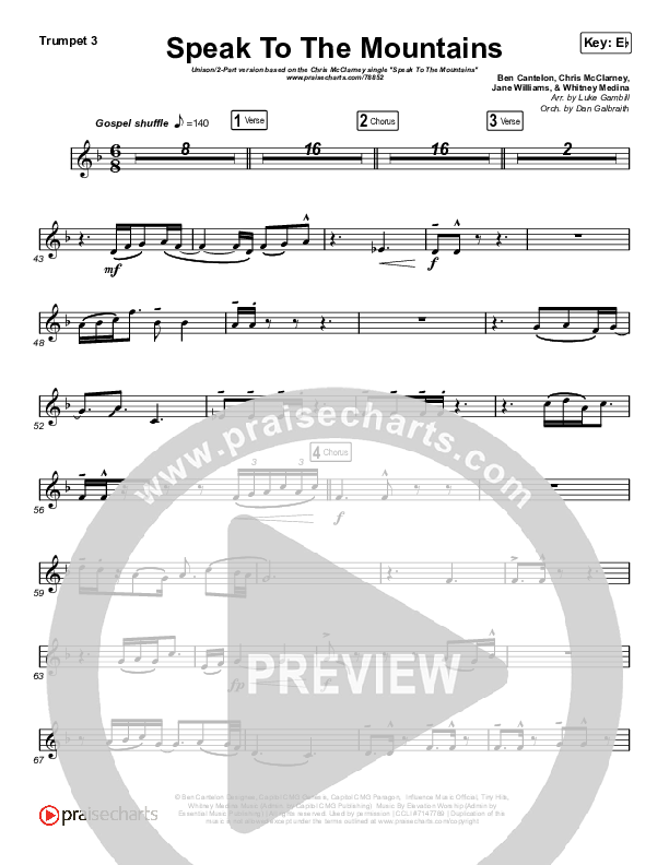 Download the Trumpet 3 sheet music for Speak To The Mountains (Unison/2-Part Choir) by Chris McClarney / Arr. Luke Gambill, from the album Speak To The Mountains - EP. This song was arranged by Luke Gambill / Daniel Galbraith in the key of Eb.