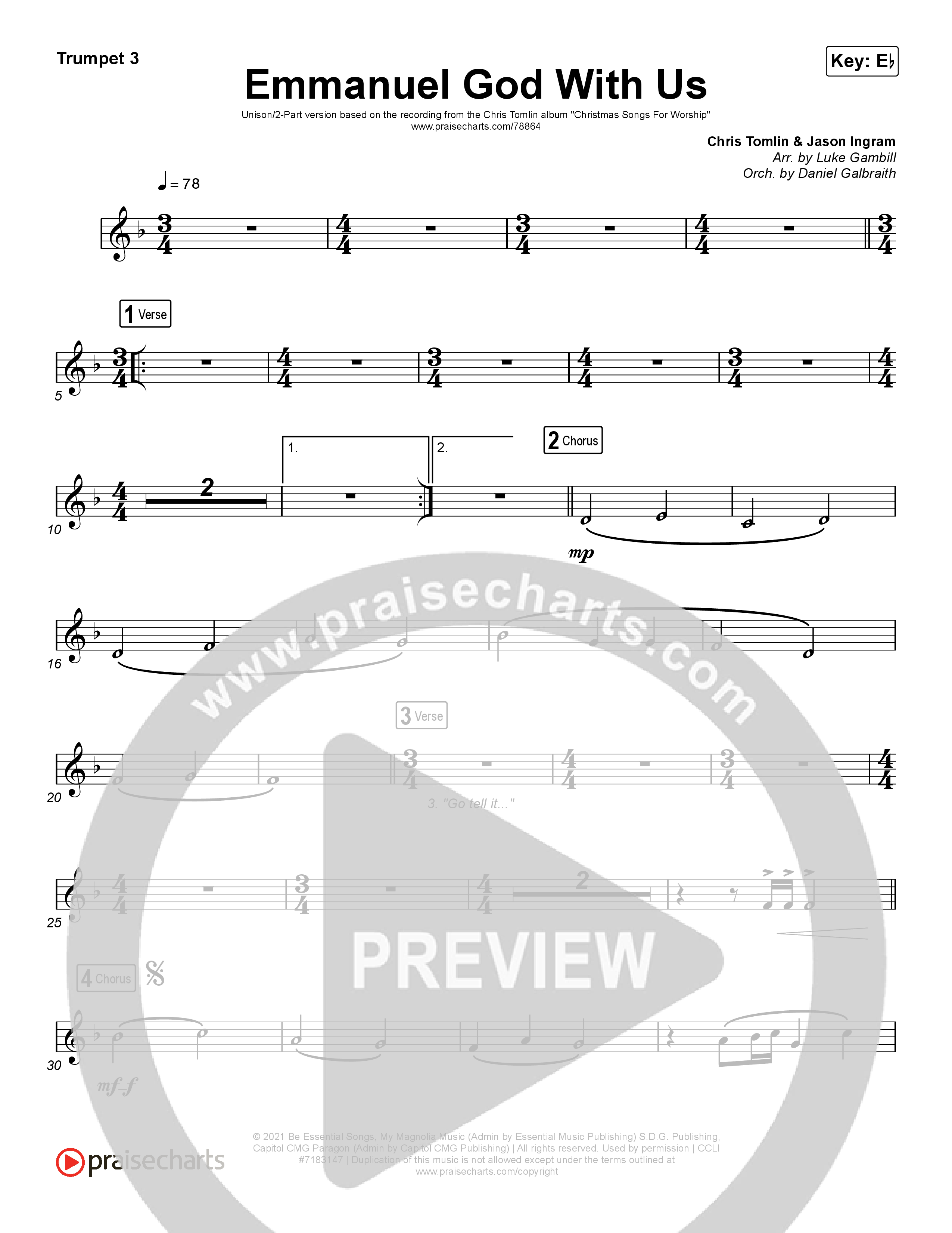 Download the Trumpet 3 sheet music for Emmanuel God With Us (Unison/2-Part Choir) by Chris Tomlin / Arr. Luke Gambill, from the album Emmanuel: Christmas Songs Of Worship. This song was arranged by Luke Gambill / Daniel Galbraith in the key of Eb.