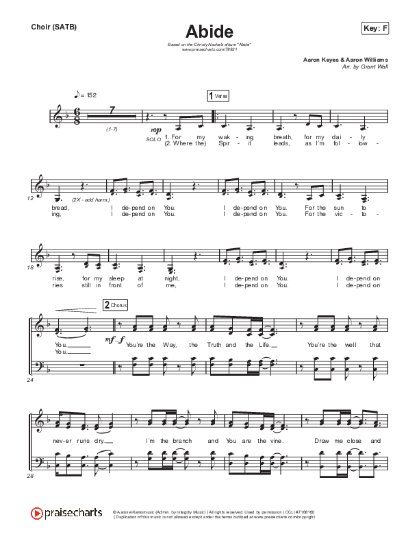 Download the Choir Sheet for Abide by Christy Nockels, from the album Abide. This song was arranged by Grant Wall in the key of F, G.
