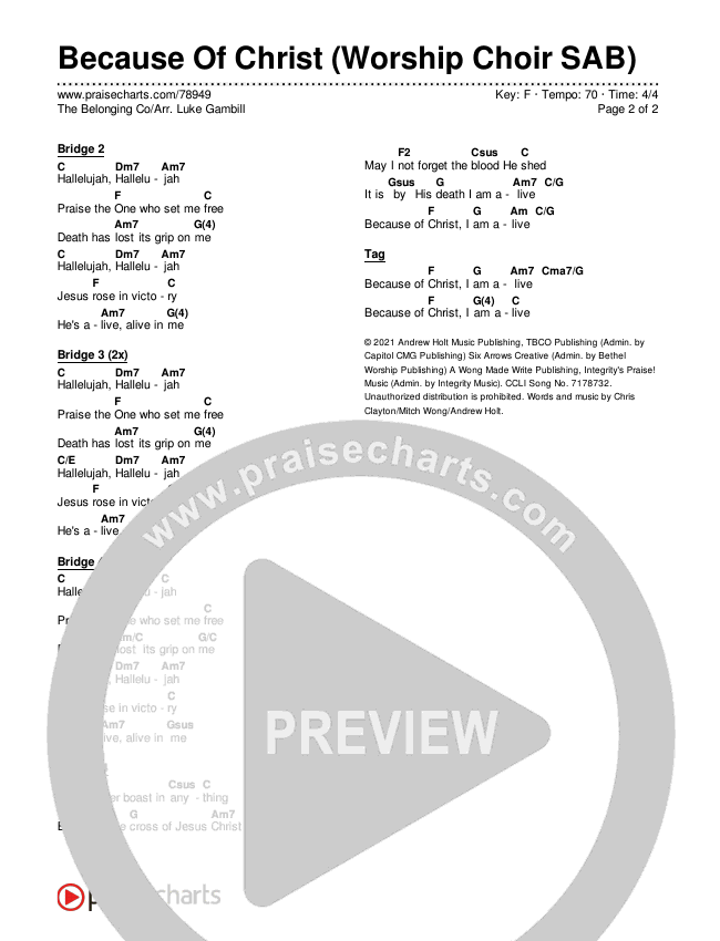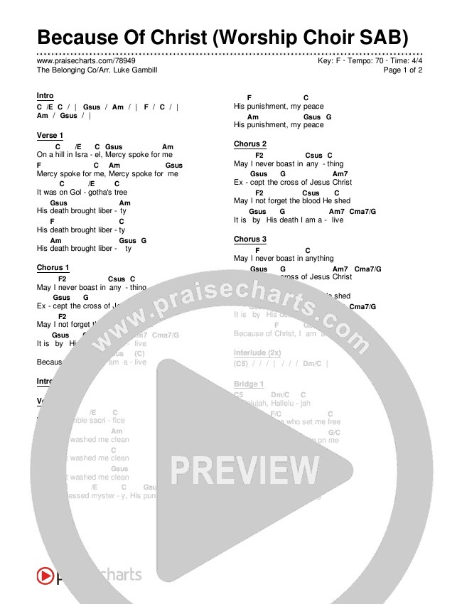 Download the PDF Chord Charts for Because Of Christ (Worship Choir SAB) by The Belonging Co / Arr. Luke Gambill, from the album Here. This song was arranged by Luke Gambill / Daniel Galbraith / Grant Wall in the key of F.