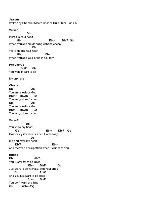 Download the PDF Chord Charts for Jealous by Maverick City Music / Kirk Franklin / Chandler Moore / Lizzie Morgan, from the album Kingdom: Book One.