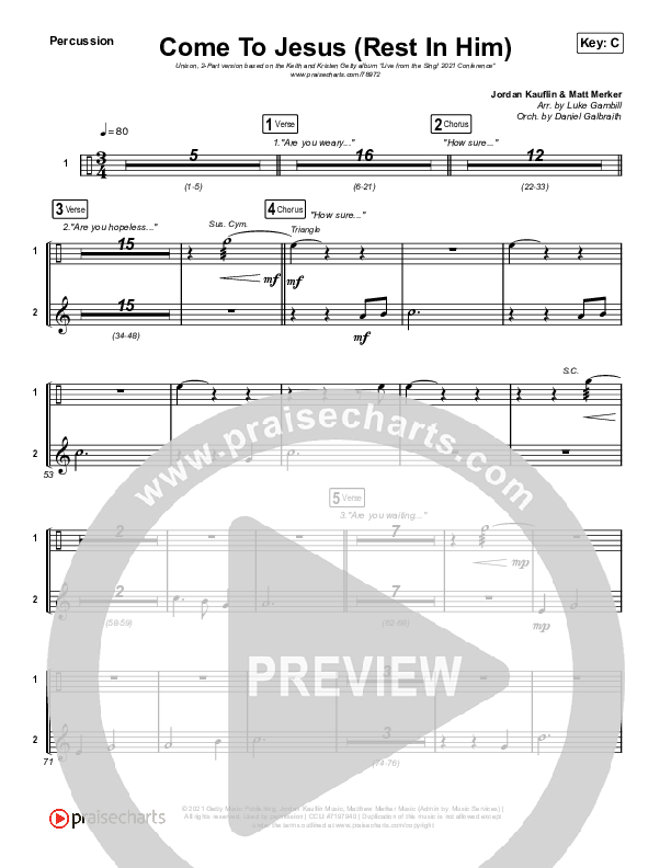 Come To Jesus (Rest In Him) (Unison/2-Part Choir) Percussion Sheet Music PDF (Keith & Kristyn Getty / Jordan Kauflin / Matt Merker / Arr. Luke Gambill)