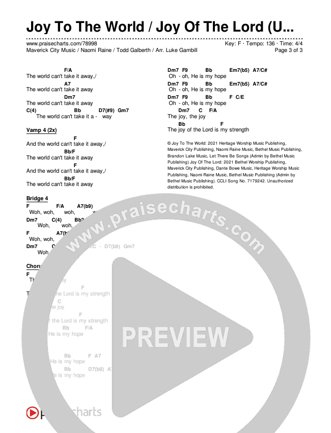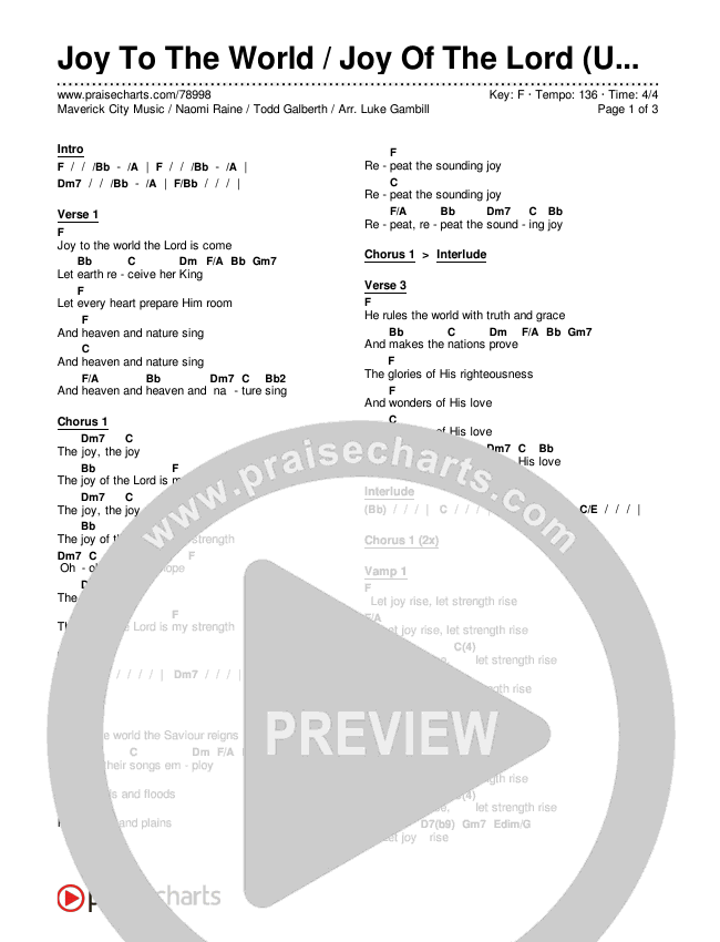 Download the PDF Chord Charts for Joy To The World / Joy Of The Lord (Unison/2-Part Choir) by Maverick City Music / Naomi Raine / Todd Galberth / Arr. Luke Gambill, from the album A Very Maverick Christmas. This song was arranged by Luke Gambill / Daniel Galbraith / Grant Wall in the key of F.