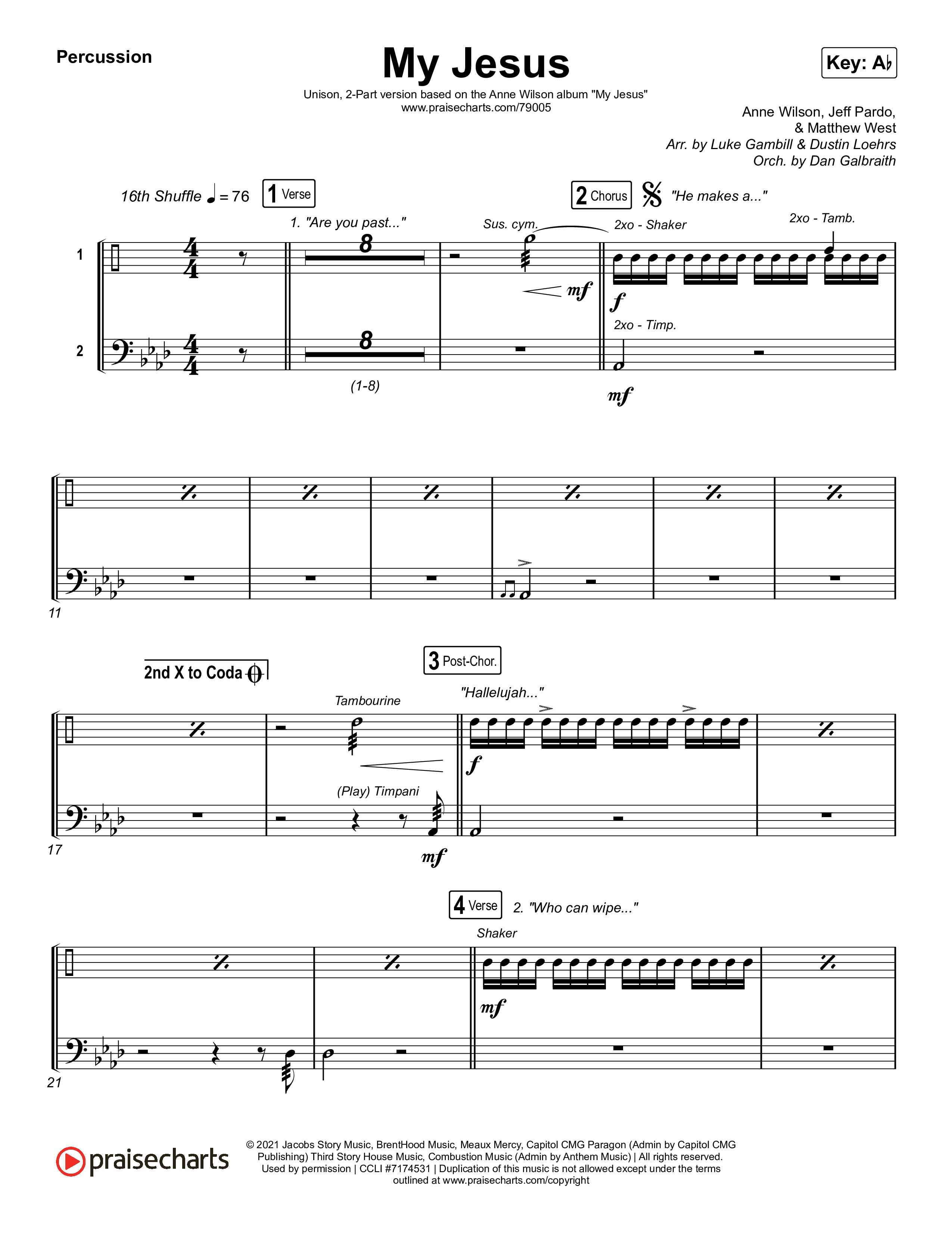 Download the percussion sheet music for My Jesus (Unison/2-Part Choir) by Anne Wilson / Arr. Luke Gambill, from the album My Jesus - Single. This song was arranged by Luke Gambill in the key of Ab.