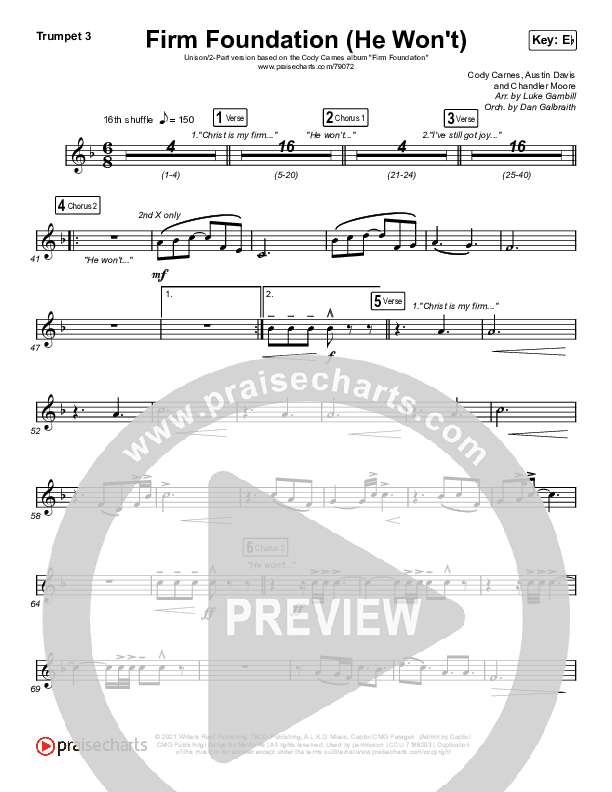 Download the Trumpet 3 sheet music for Firm Foundation (He Won't) (Unison/2-Part Choir) by Cody Carnes / Arr. Luke Gambill, from the album Firm Foundation (He Won't). This song was arranged by Luke Gambill / Daniel Galbraith / Brent Roberts in the key of Eb.
