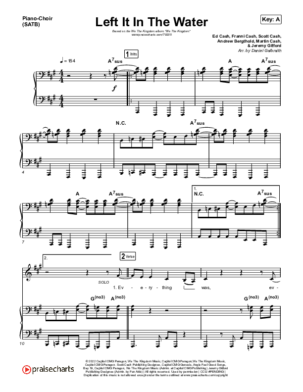 Download the PDF sheet music for Left It In The Water by We The Kingdom, from the album We The Kingdom. This song was arranged by Daniel Galbraith in the key of A, Ab.