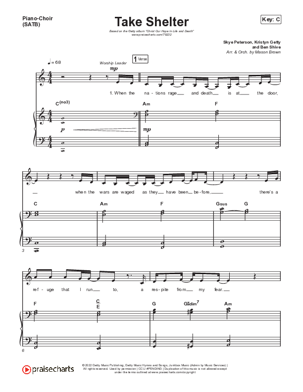 Download the PDF sheet music for Take Shelter by Keith & Kristyn Getty / Skye Peterson, from the album Christ Our Hope In Life And Death. This song was arranged by Mason Brown in the key of C, D.