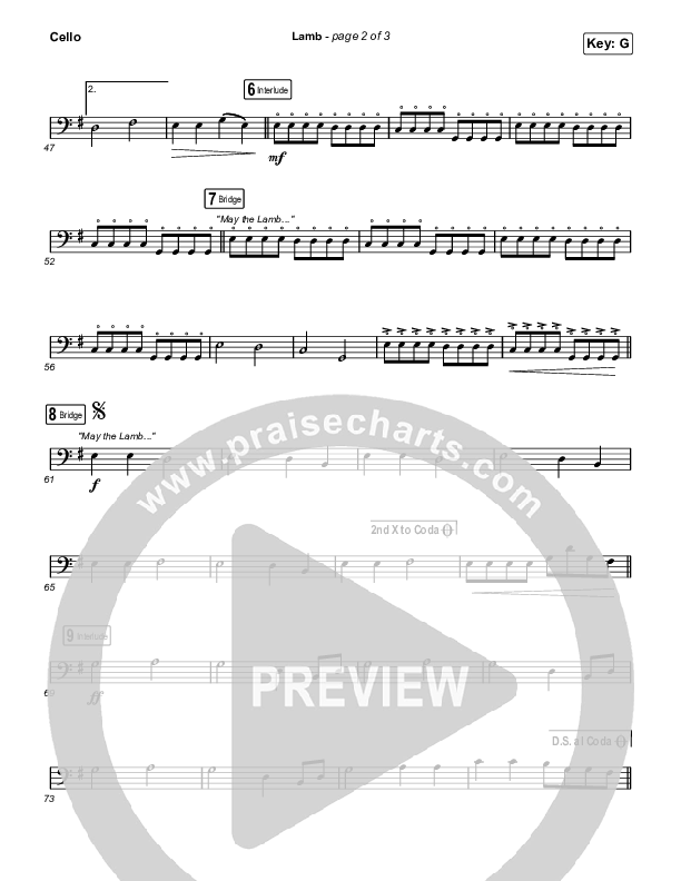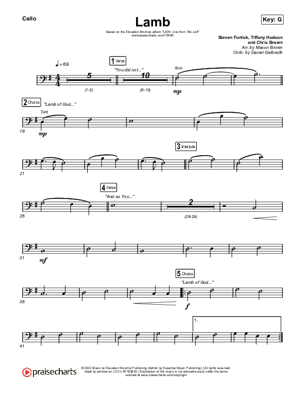 Download the Cello sheet music for Lamb (Live) by Elevation Worship / Tiffany Hudson, from the album LION: Live From The Loft. This song was arranged by Mason Brown / Daniel Galbraith in the key of F, G.