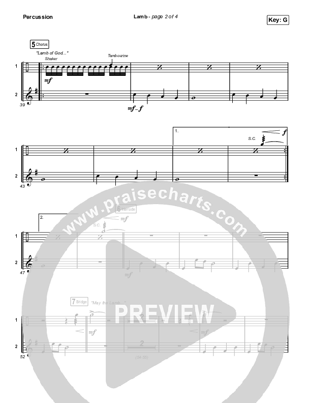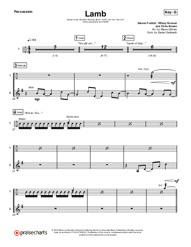 Download the percussion sheet music for Lamb (Live) by Elevation Worship / Tiffany Hudson, from the album LION: Live From The Loft. This song was arranged by Mason Brown / Daniel Galbraith in the key of F, G.