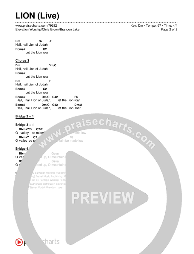 Download the PDF Chord Charts for LION (Live) by Elevation Worship / Chris Brown / Brandon Lake, from the album LION: Live From The Loft. This song was arranged by Grant Wall in the key of Cm, Dm.