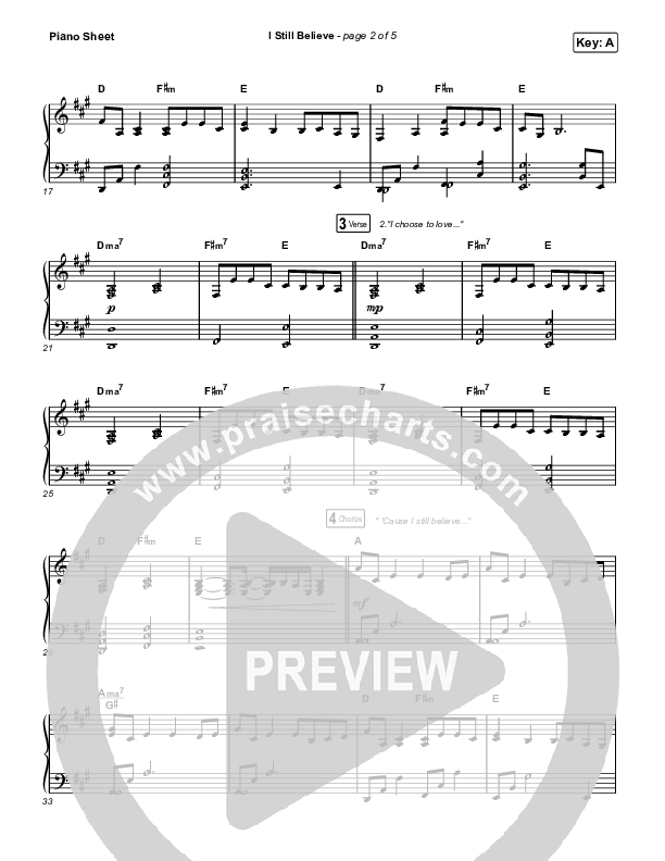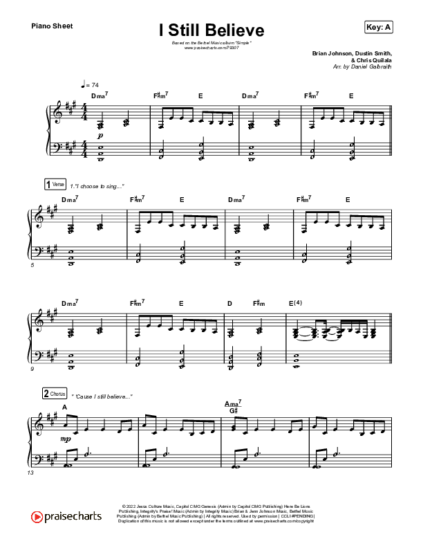 Download the piano sheet for I Still Believe by Bethel Music / Brian Johnson, from the album Simple. This song was arranged by Daniel Galbraith in the key of A, Ab.