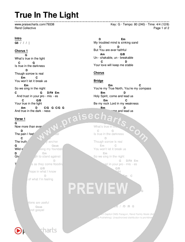 Chorus 1 What’s true in the light is true in the darkness Though sorrow is real, You won’t let it break us So we sing in the night, and trust in your promises Your true in the light and true in the darkness Verse 1 Now more than ever, keep me tethered The pain I feel has come to steal the truth that’s been my anchor Wild winds are shaking my foundations Give me strength to stand against these doubts as they come flooding To put my hope in what I know, instead of what I’m feeling Verse 2 My emotions are useful, but they’re not gospel My troubled mind is sinking sand but You are ever faithful Unshakable, unbreakable, Your love will keep me stable Bridge You’re my True North, You’re my compass, Holy Spirit, come and lead us Be my rock Lord in my weakness, Holy Spirit, come and lead us Chorus 2 What’s true in the light is true in the darkness Though sorrow is real, You won’t let it break us So we sing in the night, and trust in your promises Your true in the light and true in the darkness Your true in the light and true in the darkness...