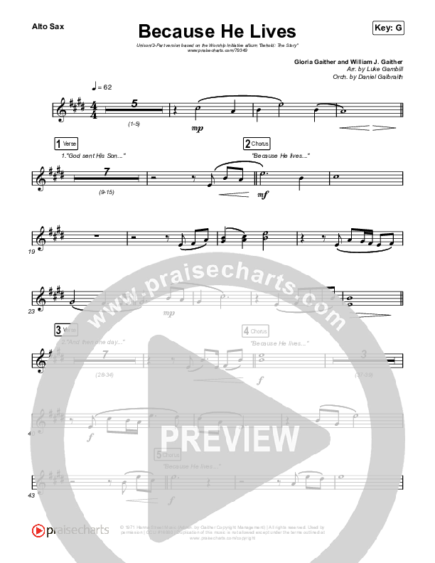 Download the AltoSax sheet music for Because He Lives (Unison/2-Part Choir) by The Worship Initiative / John Marc Kohl / Arr. Luke Gambill / Arr. Mason Brown, from the album Behold: The Story. This song was arranged by Mason Brown / Luke Gambill / Daniel Galbraith in the key of G.