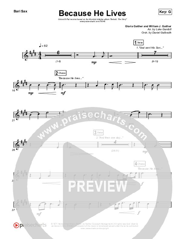 Download the Bari Sax sheet music for Because He Lives (Unison/2-Part Choir) by The Worship Initiative / John Marc Kohl / Arr. Luke Gambill / Arr. Mason Brown, from the album Behold: The Story. This song was arranged by Mason Brown / Luke Gambill / Daniel Galbraith in the key of G.