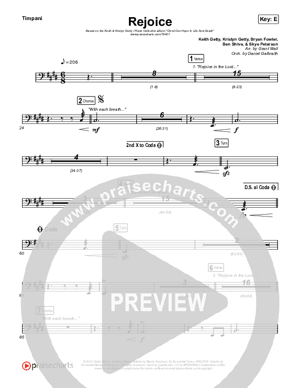 Download the Timpani sheet music for Rejoice by Keith & Kristyn Getty / Rend Collective, from the album Christ Our Hope In Life And Death. This song was arranged by Grant Wall / Daniel Galbraith in the key of E, Eb.