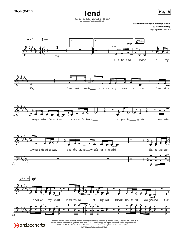 Download the Choir Sheet for Tend by Bethel Music / Emmy Rose, from the album Simple. This song was arranged by Erik Foster in the key of B, C.