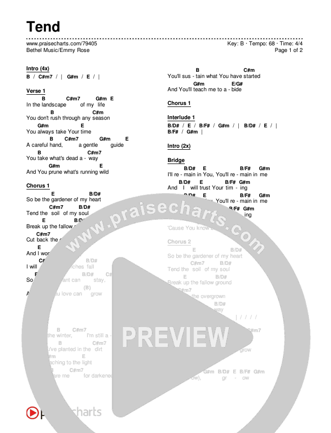 Download the PDF Chord Charts for Tend by Bethel Music / Emmy Rose, from the album Simple. This song was arranged by Erik Foster in the key of B, C.