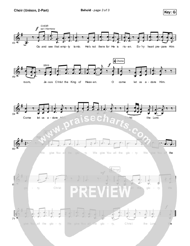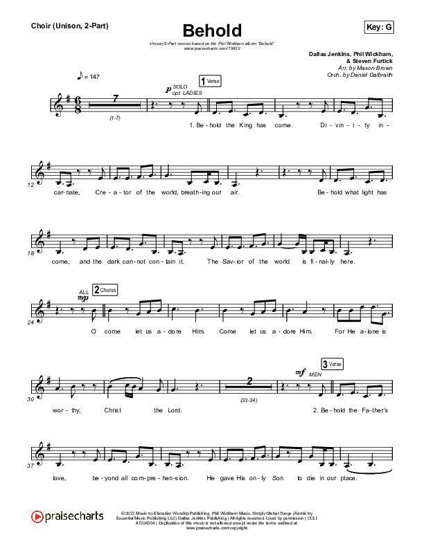 Download the PDF sheet music for Behold (Unison/2-Part Choir) by Phil Wickham / Anne Wilson / Arr. Mason Brown, from the album Behold. This song was arranged by Mason Brown / Daniel Galbraith in the key of G.