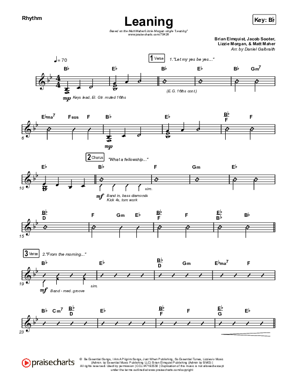 Download the Rhythm Chart for Leaning by Matt Maher / Lizzie Morgan, from the album Leaning. This song was arranged by Daniel Galbraith in the key of A, Bb.