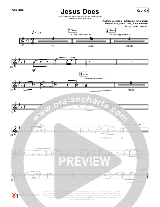 Download the AltoSax sheet music for Jesus Does by We The Kingdom, from the album We The Kingdom. This song was arranged by Daniel Galbraith in the key of G, Gb.