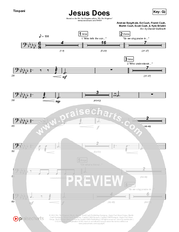 Download the Timpani sheet music for Jesus Does by We The Kingdom, from the album We The Kingdom. This song was arranged by Daniel Galbraith in the key of G, Gb.