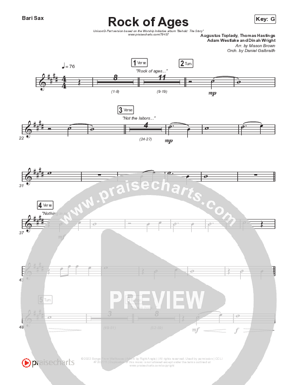 Download the Bari Sax sheet music for Rock Of Ages (Unison/2-Part Choir) by The Worship Initiative / Dinah Wright / Grace Tanner / Arr. Mason Brown, from the album Behold: The Story. This song was arranged by Mason Brown / Daniel Galbraith in the key of G.