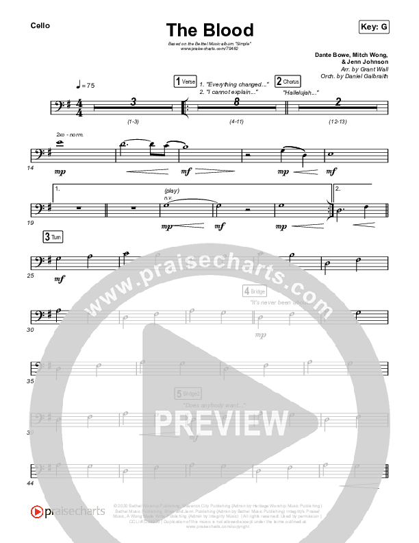 Download the Cello sheet music for The Blood by Bethel Music / Jenn Johnson / Mitch Wong, from the album Simple. This song was arranged by Grant Wall / Daniel Galbraith in the key of Ab, G.