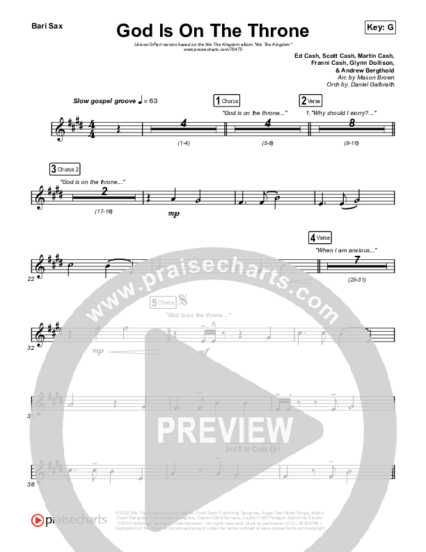 Download the Bari Sax sheet music for God Is On The Throne (Unison/2-Part Choir) by We The Kingdom / Arr. Mason Brown, from the album We The Kingdom. This song was arranged by Mason Brown / Daniel Galbraith in the key of G.