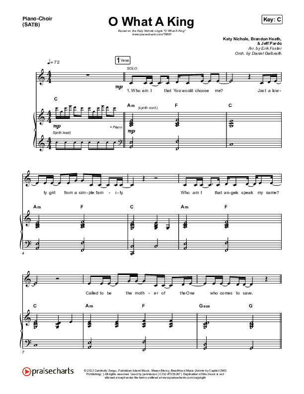 Download the PDF sheet music for O What A King by Katy Nichole, from the album O What A King. This song was arranged by Erik Foster / Daniel Galbraith in the key of Bb, C.