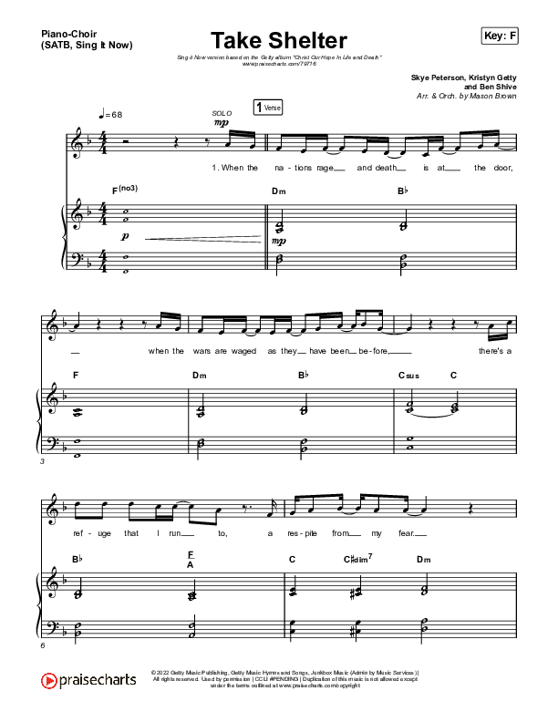 Download the PDF sheet music for Take Shelter (Sing It Now SATB) by Keith & Kristyn Getty / Skye Peterson / Arr. Mason Brown, from the album Christ Our Hope In Life And Death. This song was arranged by Mason Brown in the key of F.
