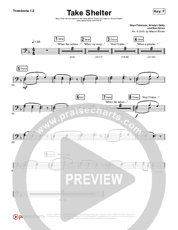 Download the Trombone 1,2 sheet music for Take Shelter (Sing It Now SATB) by Keith & Kristyn Getty / Skye Peterson / Arr. Mason Brown, from the album Christ Our Hope In Life And Death. This song was arranged by Mason Brown in the key of F.
