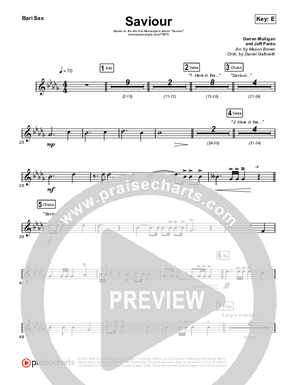 Download the Bari Sax sheet music for Saviour by We Are Messengers, from the album Saviour. This song was arranged by Mason Brown / Daniel Galbraith in the key of D, E.