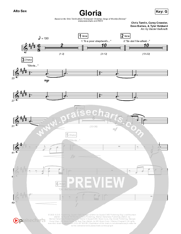 Download the AltoSax sheet music for Gloria by Chris Tomlin, from the album Emmanuel: Christmas Songs Of Worship (Deluxe). This song was arranged by Daniel Galbraith in the key of F, G.