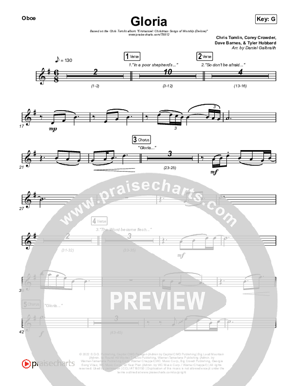 Download the Oboe sheet music for Gloria by Chris Tomlin, from the album Emmanuel: Christmas Songs Of Worship (Deluxe). This song was arranged by Daniel Galbraith in the key of F, G.