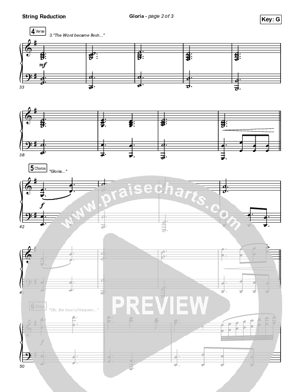 Download the String Reduction sheet music for Gloria by Chris Tomlin, from the album Emmanuel: Christmas Songs Of Worship (Deluxe). This song was arranged by Daniel Galbraith in the key of F, G.