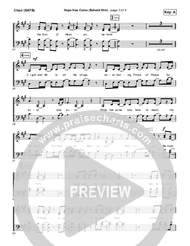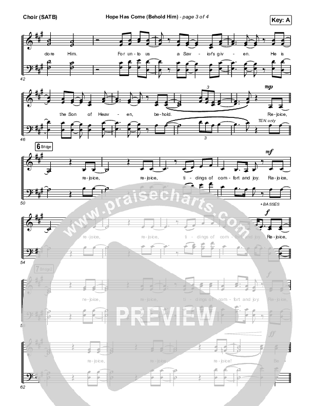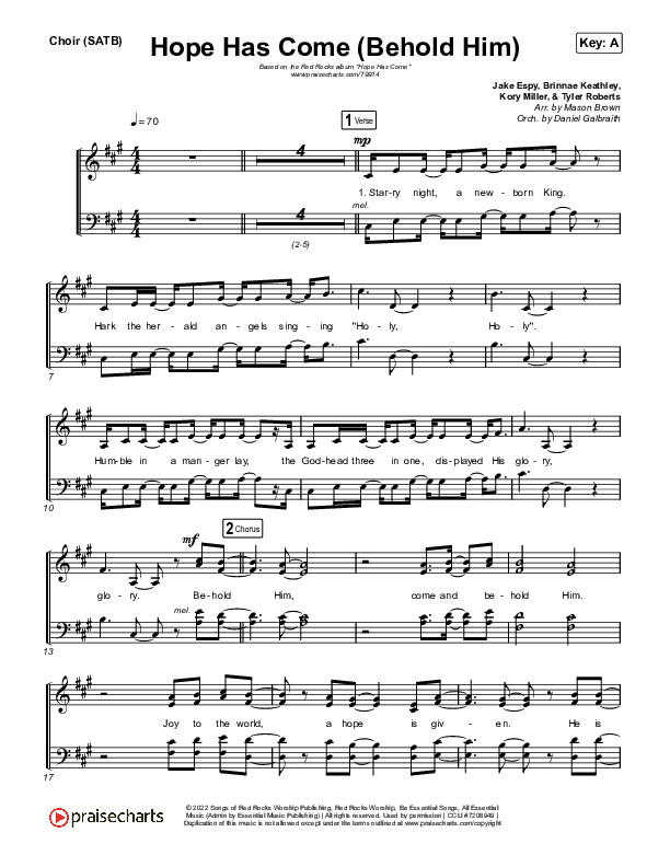 Download the Choir Sheet for Hope Has Come (Behold Him) by Red Rocks Worship, from the album Hope Has Come. This song was arranged by Mason Brown / Daniel Galbraith in the key of A, G.