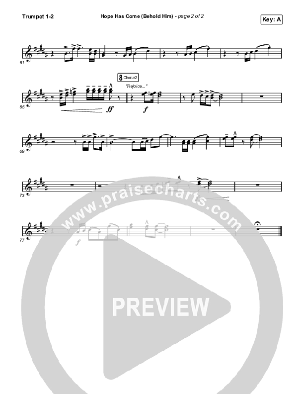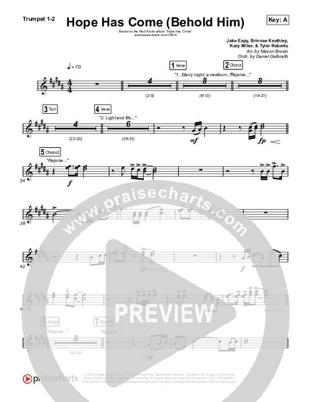 Download the trumpet sheet music for Hope Has Come (Behold Him) by Red Rocks Worship, from the album Hope Has Come. This song was arranged by Mason Brown / Daniel Galbraith in the key of A, G.